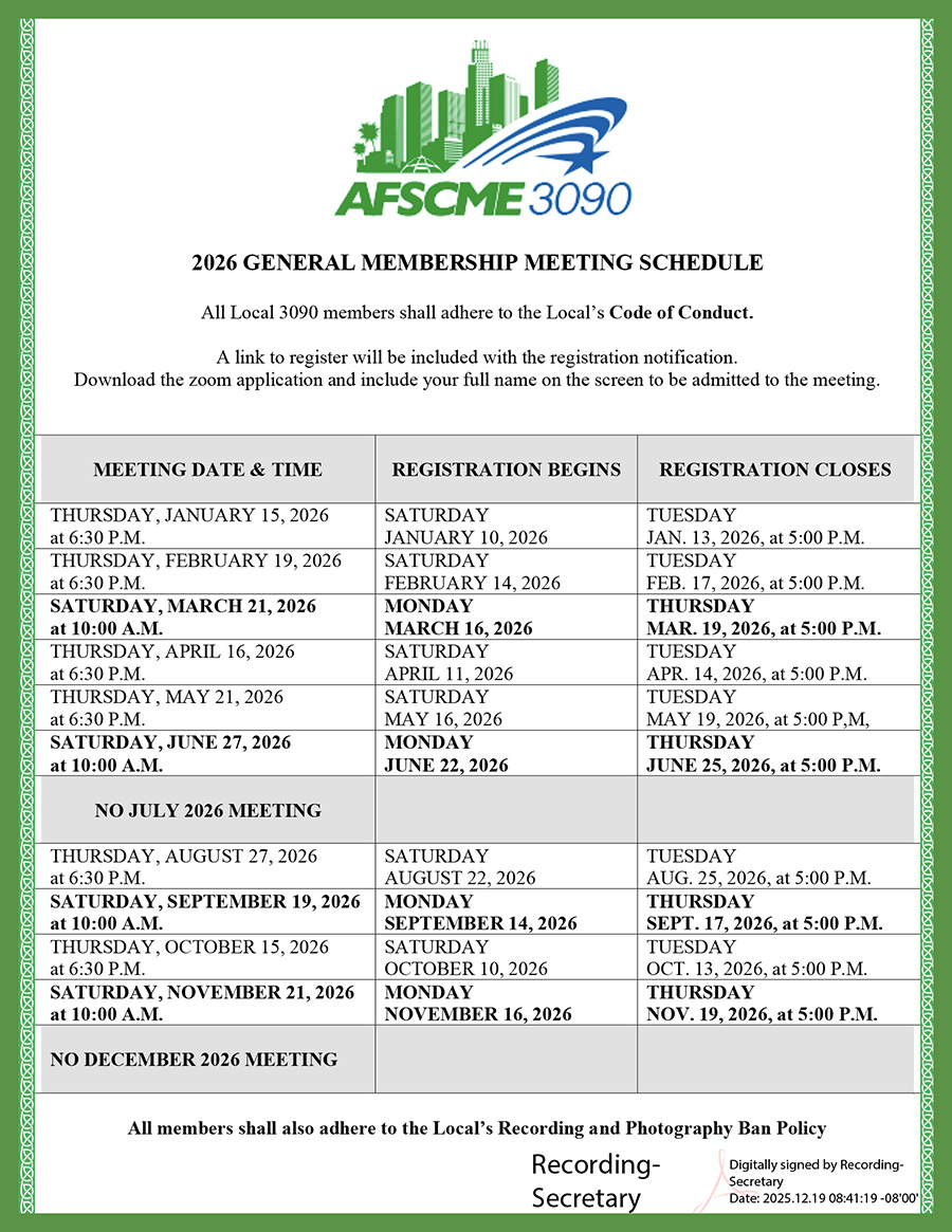 AFSCME Local 3090 is committed to ensuring a safe, secure and respectful environment for everyone – members, non-members, staff, vendors, guests and visitors. It is our expectation that all members adhere to both our AFSCME Local and International Constitutions. Members are to demonstrate civil and respectful behavior at all meetings, when representing the union and when conducting union business. Local 3090 expressly prohibits: